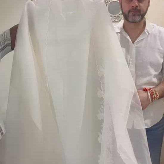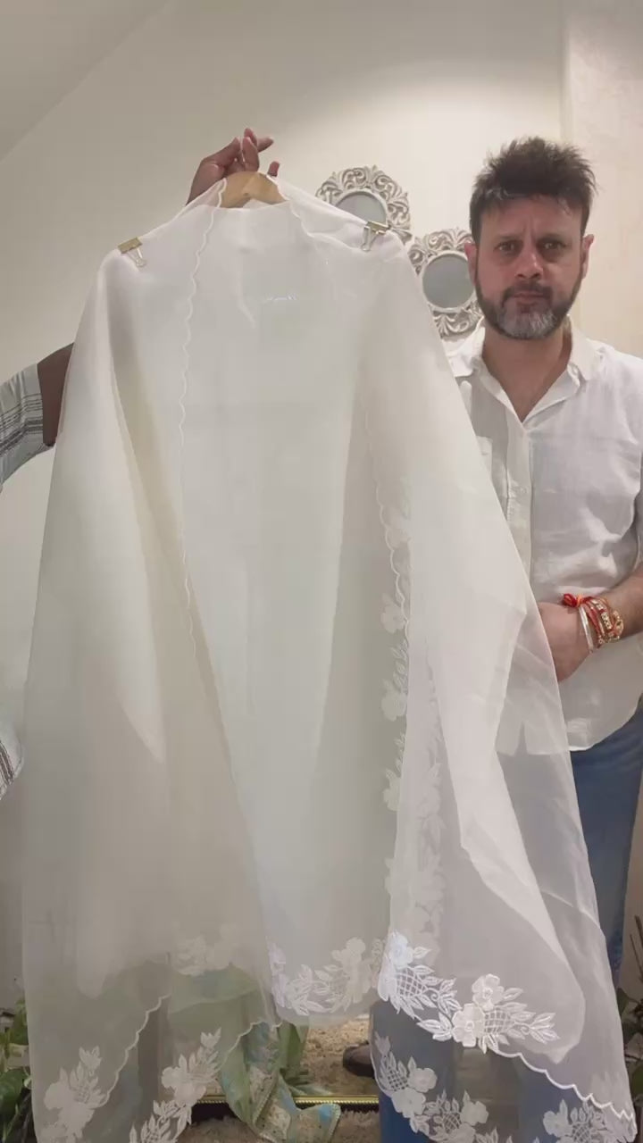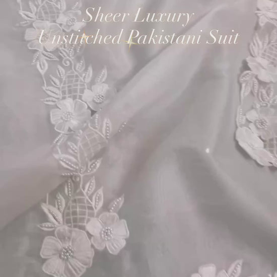 Elevate your style with this unstitched pure Organza Silk Pakistani suit, beautifully adorned with intricate pearl Parsi embroidery. The shirt showcases exquisite detailing, while the dupatta is finished with fine craftsmanship on all corners. Paired with a luxurious pure crepe bottom, this ensemble offers unmatched elegance, ready to be tailored to your perfect fit. An heirloom-worthy choice for weddings, festive occasions, and grand celebrations.