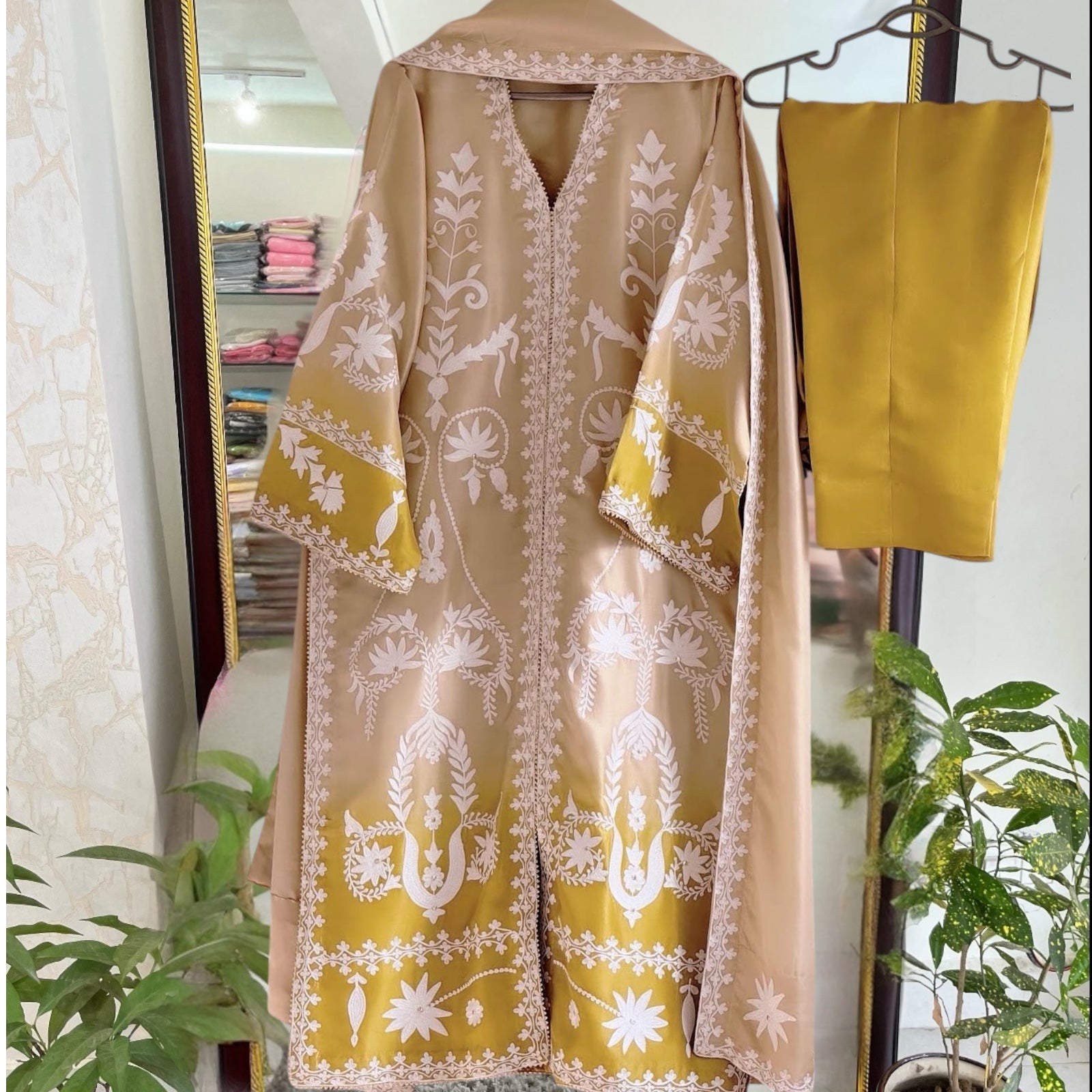 "Enchanting Elegance: Pure Silk 80 grams Pakistani Suits Adorned with Exquisite Parsi Embroidery MS005 Ombre Beige and Yellow