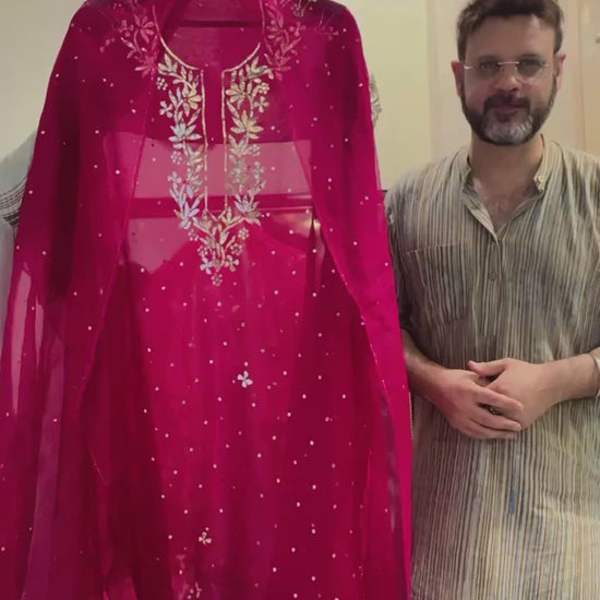 This premium Lucknowi collection is the epitome of sheer luxury. Embellished with love, the stunning pure organza silk kurta and dupatta feature intricate craftsmanship of Lucknowi chikankari handwork and delicate mukaish handwork. Complete the look with the included cotton silk lowers. Make heads turn with this elegant and fashionable ensemble.